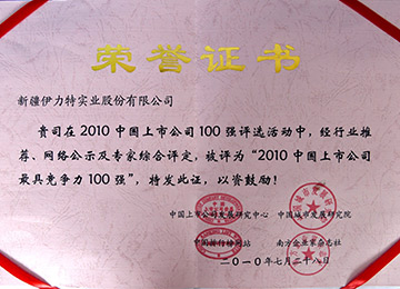 中國上市公司發展研究中心、中國城市發展研究院、中國排行榜網站、南方企業家雜志社共同評定,伊力特實業股份有限公司為“2010中國最佳誠信經營上市公司100強”和“2010中國上市公司最具競爭力100強”